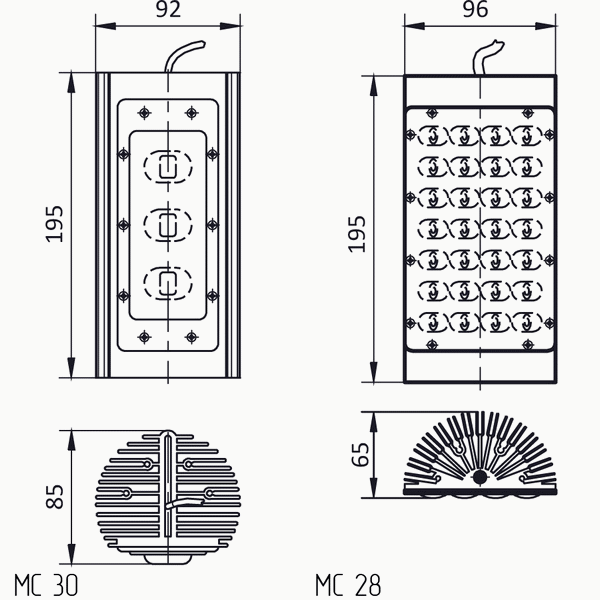 Предлагаемые нами конструкции содержат либо 28 светодиодов мощностью по 1Вт каждый, либо матрицу из трех 10-ваттных светодиодов. Матрицы снабжены подложкой из алюминиевого сплава со сформованным радиатором, а лицевая поверхность накрыта поликарбонатом с повышенной пропускной способностью и сформованными линзами. Матрица запаяна в герметичный корпус, отлично противостоящий атмосферным осадкам.